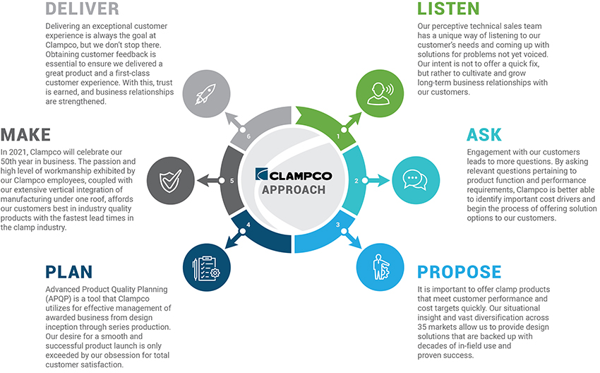 Clampco differentiates ourselves by offering a Solution Based Sales Approach that focuses on customer needs. Our proven 6 Step Approach provides a disciplined process that helps our customers: